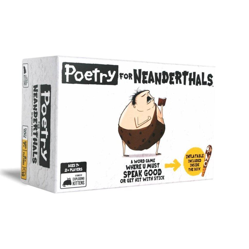 Poetry for Neanderthals is a competitive word-guessing game where you can only give clues by speaking in single syllables. So, instead of saying "broccoli," you'd say something like "green thing you eat for live long and have good health." If you mess up and use a big word, such as "vegetable," you get bopped on the head with a NO! Stick. It's a game that forces you to explain complicated ideas using simple vocabulary.