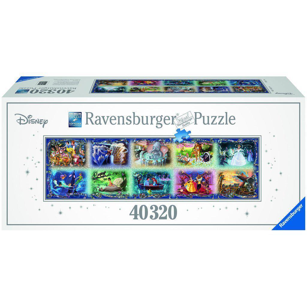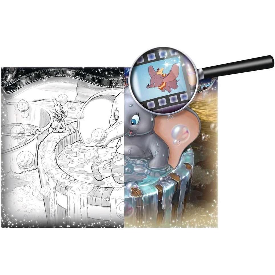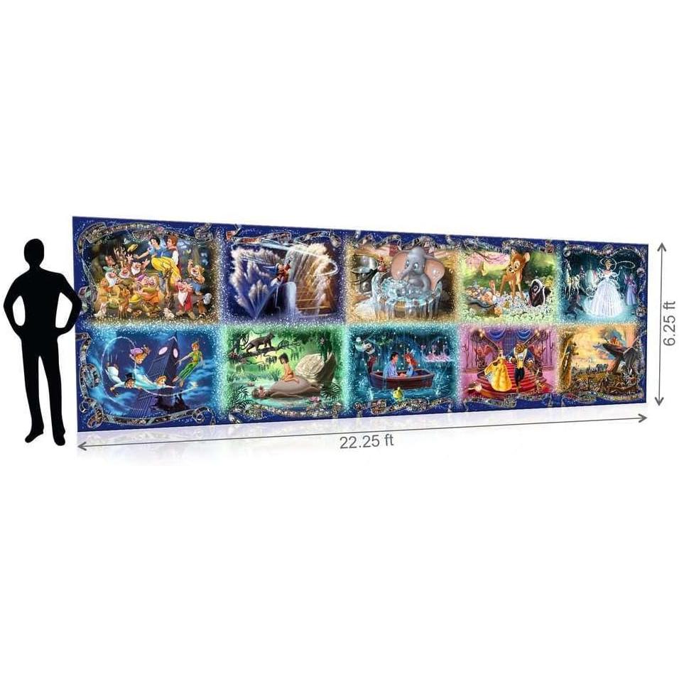This giant puzzle features 10 hand-drawn scenes from iconic Disney films including, Snow White, Fantasia, Dumbo, Bambi, Cinderella, Peter Pan, The Jungle Book, The Little Mermaid, Beauty and the Beast and The Lion King. Each scene is framed by a film strip indicating the film's year of release and depicting additional scenes from each movie. Instructions include helpful hints for assembling the puzzle and a reference guide.