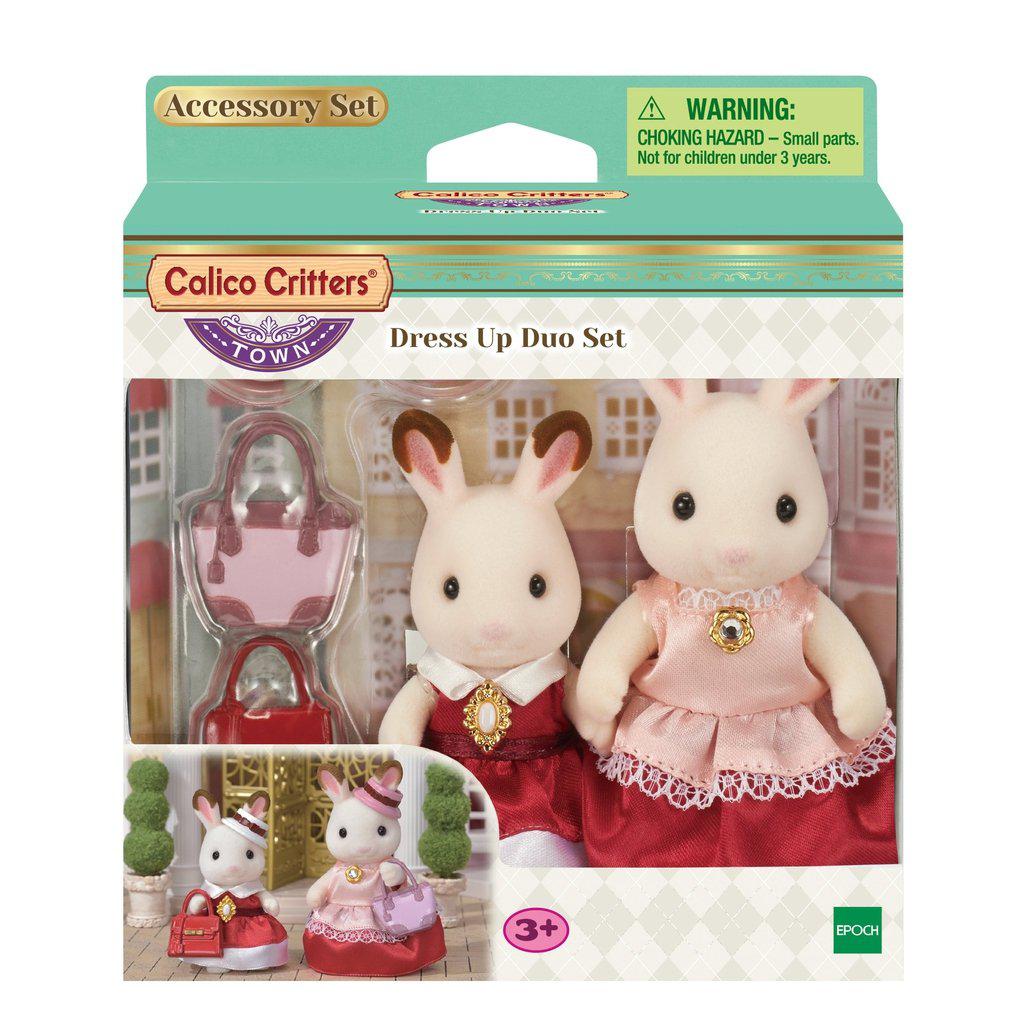 The Dress Up Duo Set is a gorgeous two figure set containing the Hopscotch Rabbit mother and girl in elegant dresses. They wear special satin clothing for going out to town. Lovely handbags and hats for the two figures are also included.