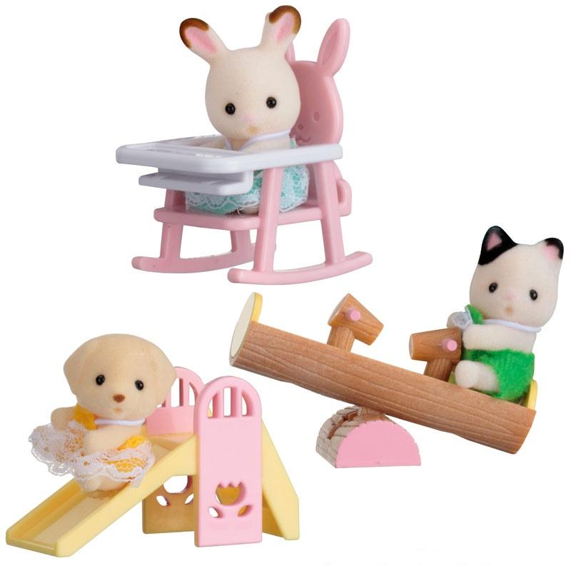 • Clear house-shaped carrying case includes either Hopscotch Rabbit baby sitting in a high chair, Yellow Labrador baby on slide, or Tuxedo cat baby on a see-saw
