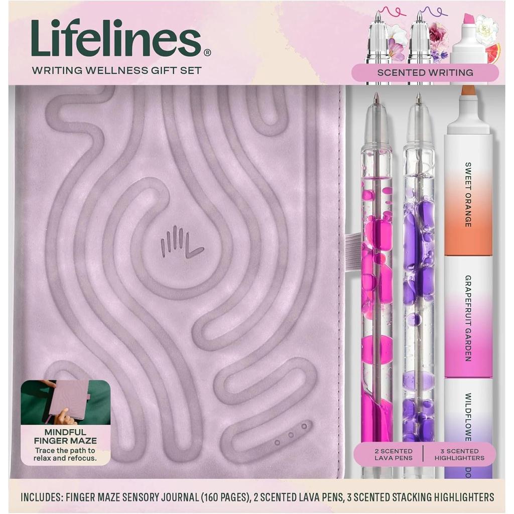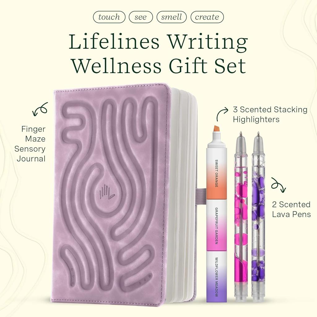 The Lifelines Writing Wellness Gift Set helps you slow down, tune in, and reconnect through sensory expression. Engage sight, scent, and touch as you transform everyday journaling into a grounding ritual. Includes a Finger Maze Sensory Journal, 2 Scented Lava Pens, and 3 Scented Stacking Highlighters.